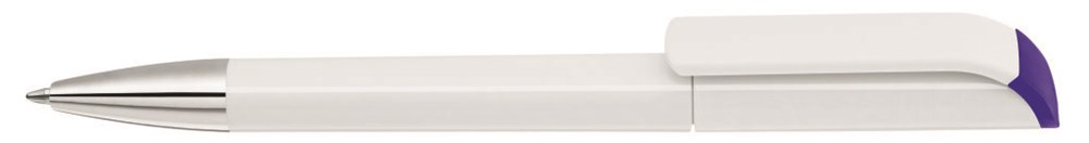 Drehkugelschreiber mit gedeckt glänzendem Gehäuse in weiß, farbig glänzendem Stopfen und Spitze glanzverchromt.