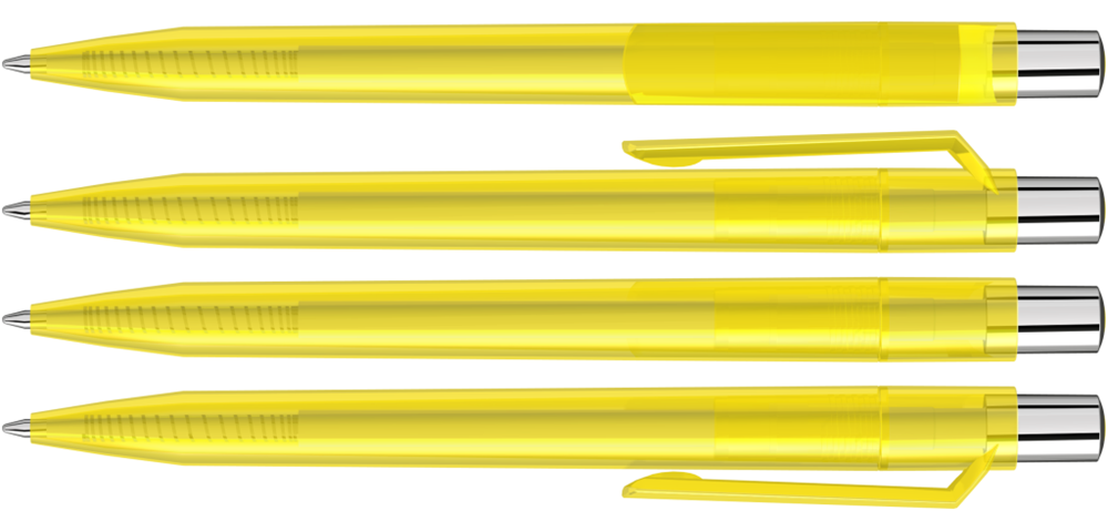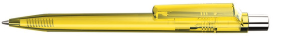 Druckkugelschreiber mit transparent glänzendem Gehäuse, silber glänzendem Drücker und farbigem Stopfen.