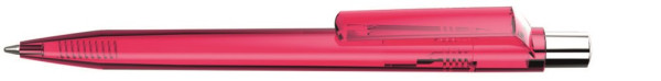 Druckkugelschreiber mit transparent glänzendem Gehäuse, silber glänzendem Drücker und farbigem Stopfen.