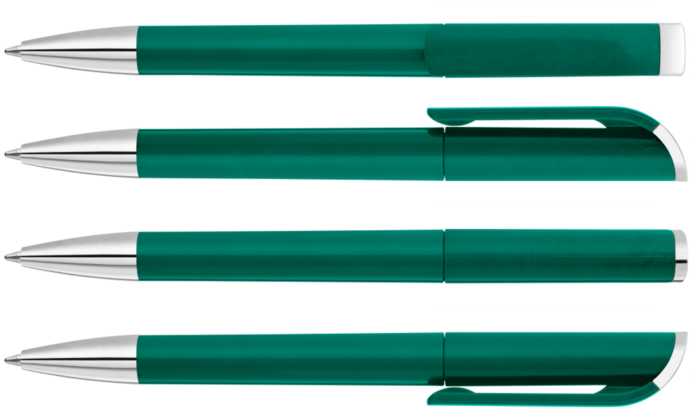 Drehkugelschreiber mit gedeckt glänzendem Gehäuse, Stopfen und Spitze glanzverchromt.