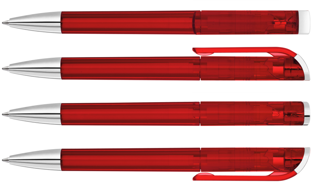 Drehkugelschreiber mit transparent glänzendem Gehäuse, Stopfen und Spitze glanzverchromt. mehr