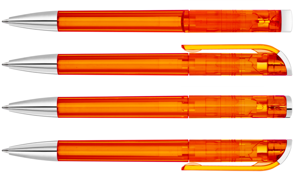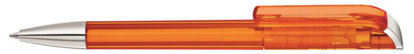 Drehkugelschreiber mit transparent glänzendem Gehäuse, Stopfen und Spitze glanzverchromt. mehr