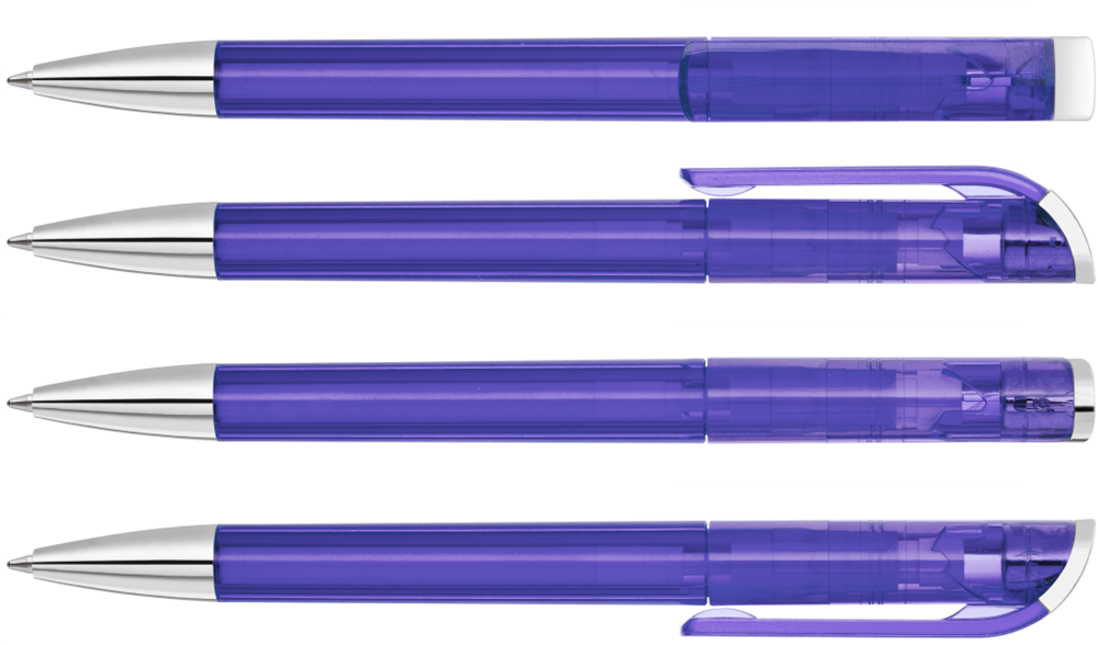 Drehkugelschreiber mit transparent glänzendem Gehäuse, Stopfen und Spitze glanzverchromt. mehr