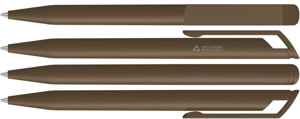 Drehkugelschreiber mit gedeckt glänzendem Gehäuse aus 100% recyceltem Post-Consumer-Kunststoff.