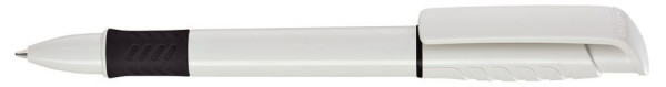 Druckkugelschreiber mit gedeckt glänzendem Gehäuse in weiß, Griffzone und Zierring farbig oder unifarben gedeckt glänzend schwarz.