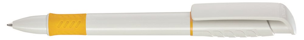 Druckkugelschreiber mit gedeckt glänzendem Gehäuse in weiß, Griffzone und Zierring farbig oder unifarben gedeckt glänzend schwarz.