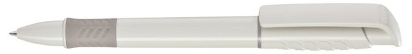 Druckkugelschreiber mit gedeckt glänzendem Gehäuse in weiß, Griffzone und Zierring farbig oder unifarben gedeckt glänzend schwarz.