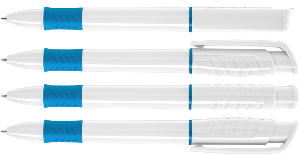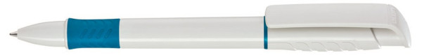 Druckkugelschreiber mit gedeckt glänzendem Gehäuse in weiß, Griffzone und Zierring farbig oder unifarben gedeckt glänzend schwarz.