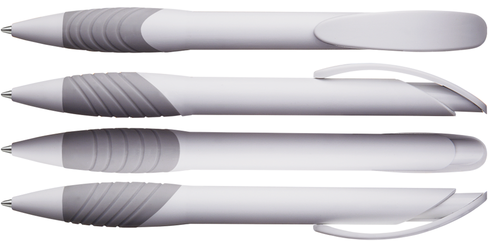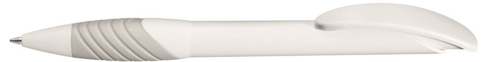 Druckkugelschreiber mit gedeckt mattem Gehäuse, Bogenclipdrücker und Spitze in weiß, ergonomische, farbige Gummigriffzone.