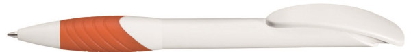 Druckkugelschreiber mit gedeckt mattem Gehäuse, Bogenclipdrücker und Spitze in weiß, ergonomische, farbige Gummigriffzone.