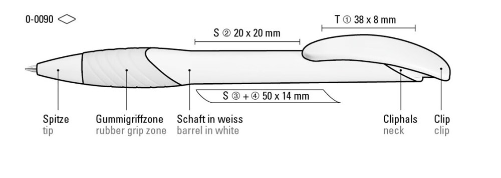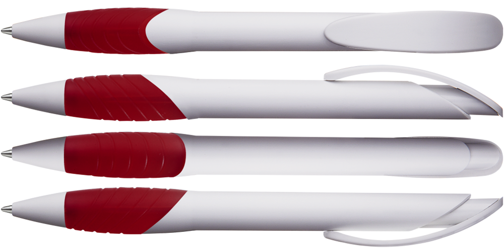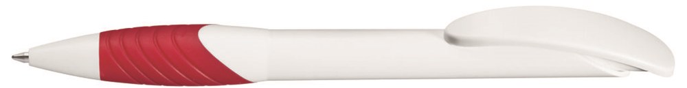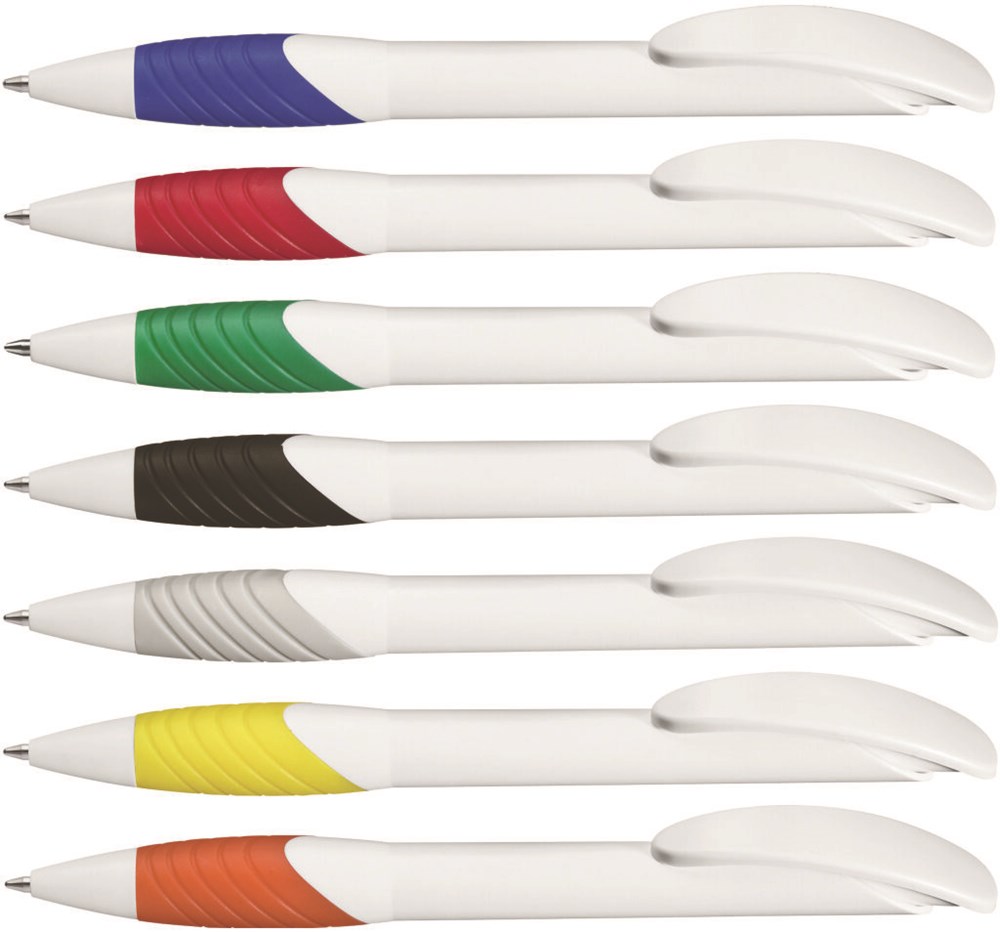 Druckkugelschreiber mit gedeckt mattem Gehäuse, Bogenclipdrücker und Spitze in weiß, ergonomische, farbige Gummigriffzone.