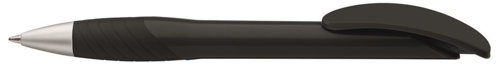 Druckkugelschreiber mit gedeckt glänzendem Gehäuse, Bogenclipdrücker, ergonomische Gummigriffzone und Metallspitze matt verchromt.