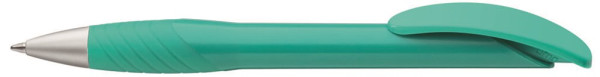 Druckkugelschreiber mit gedeckt glänzendem Gehäuse, Bogenclipdrücker, ergonomische Gummigriffzone und Metallspitze matt verchromt.