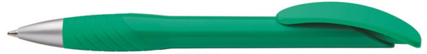 Druckkugelschreiber mit gedeckt glänzendem Gehäuse, Bogenclipdrücker, ergonomische Gummigriffzone und Metallspitze matt verchromt.