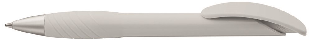 Druckkugelschreiber mit gedeckt glänzendem Gehäuse, Bogenclipdrücker, ergonomische Gummigriffzone und Metallspitze matt verchromt.