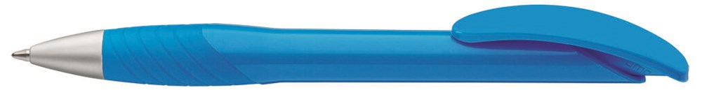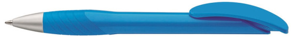 Druckkugelschreiber mit gedeckt glänzendem Gehäuse, Bogenclipdrücker, ergonomische Gummigriffzone und Metallspitze matt verchromt.