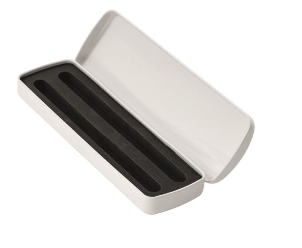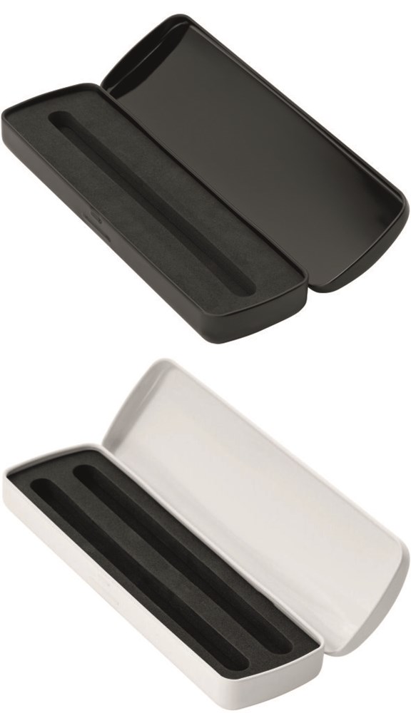 Metall-Klappetui für ein oder zwei Schreibgeräte mit lackierter Oberfläche in schwarz oder weiß.