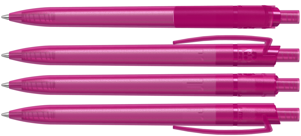 Druckkugelschreiber aus recyceltem PET-Material mit transparent gefrostetem Gehäuse, Clip und Drücker.