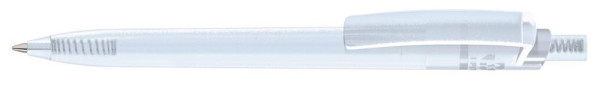Druckkugelschreiber aus recyceltem PET-Material mit transparent gefrostetem Gehäuse, Clip und Drücker.