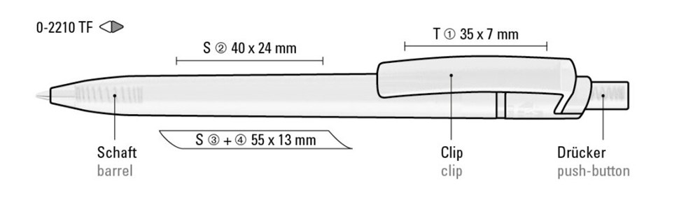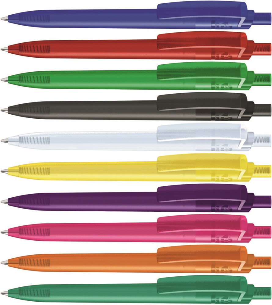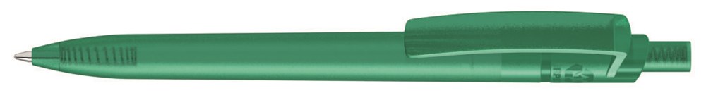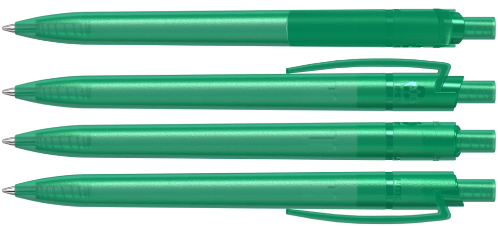 Druckkugelschreiber aus recyceltem PET-Material mit transparent gefrostetem Gehäuse, Clip und Drücker.