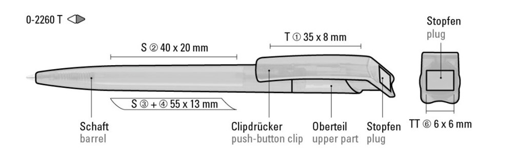 Druckkugelschreiber aus recyceltem PET-Material mit transparent glänzendem Gehäuse und gedecktem Stopfen.