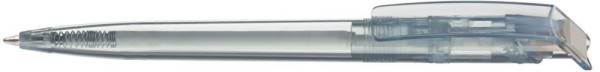 Druckkugelschreiber aus recyceltem PET-Material mit klar transparent glänzendem Gehäuse und gedecktem Stopfen.