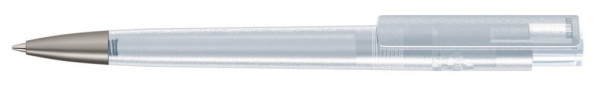 Druckkugelschreiber aus recyceltem PET-Material mit transparent gefrostetem Gehäuse und Clip sowie Metallspitze aus recyceltem Aluminium in silber matt.