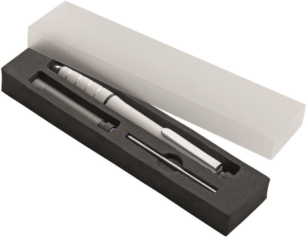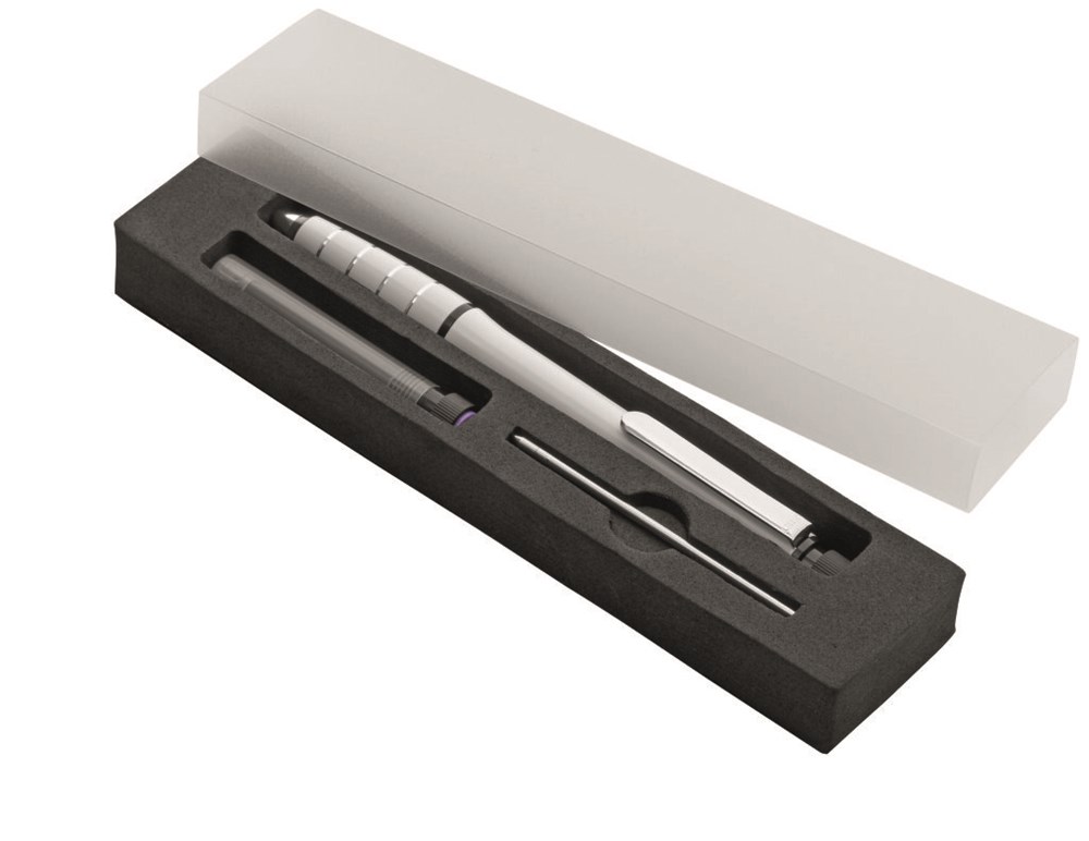 2in1-Set - bestehend aus 2in1 Metall-Drehkugelschreiber aus Aluminium mit integriertem gelb schreibenden Textmarker im Schaft, einer Ersatztextmarkerpatrone und einer D1 Mine schwarzschreibend - im praktischen Etui mit transparentem Kunststoffschuber inkl. Gebrauchsanweisung.