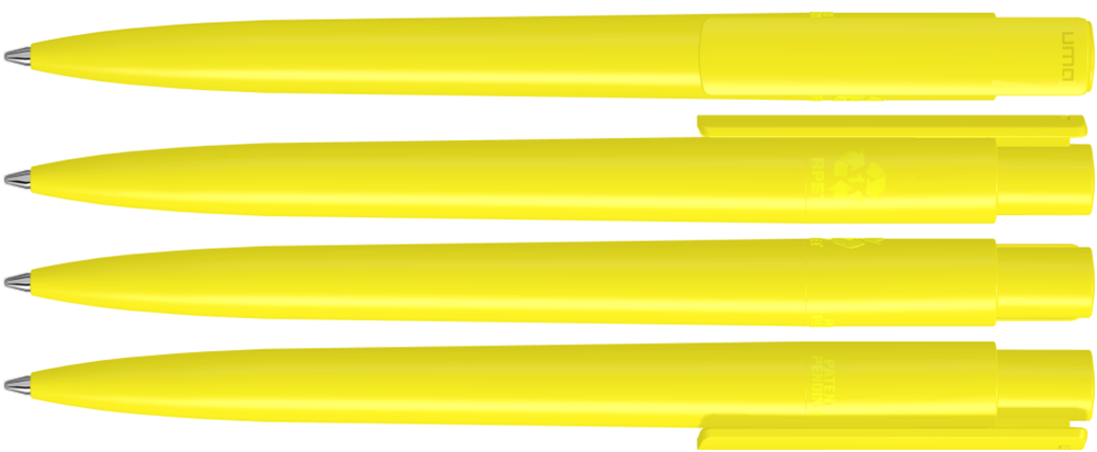Druckkugelschreiber aus recyceltem PET-Material mit gedeckt glänzendem Gehäuse und Clip.
