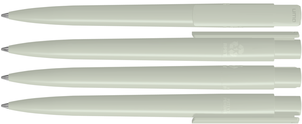 Druckkugelschreiber aus recyceltem PET-Material mit gedeckt glänzendem Gehäuse und Clip.