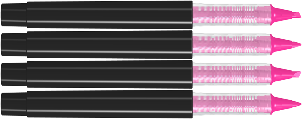 Flüssig-Textmarker mit Gehäuse aus recyceltem PET-Material in gedeckt glänzend weiß oder schwarz. Stopfen in den 6 möglichen Schreibfarben.