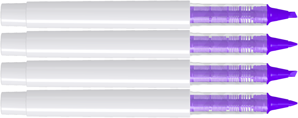 Flüssig-Textmarker mit Gehäuse aus recyceltem PET-Material in gedeckt glänzend weiß oder schwarz. Stopfen in den 6 möglichen Schreibfarben.