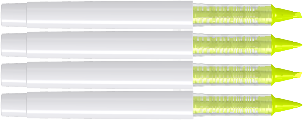 Flüssig-Textmarker mit Gehäuse aus recyceltem PET-Material in gedeckt glänzend weiß oder schwarz. Stopfen in den 6 möglichen Schreibfarben.