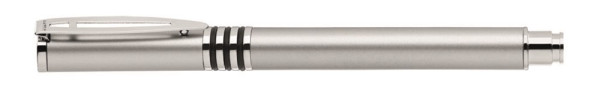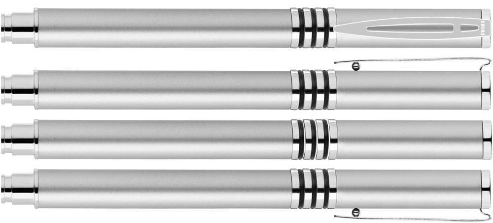 Metall-Rollerball mit glänzend lackiertem Aluminiumschaft und 3 eingelassenen, kombinierbaren Gummiringen. Metallbeschlagteile glanzverchromt.