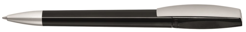 Drehkugelschreiber mit gedeckt glänzendem Gehäuse. Metallclip und schwere Metallspitze matt verchromt.