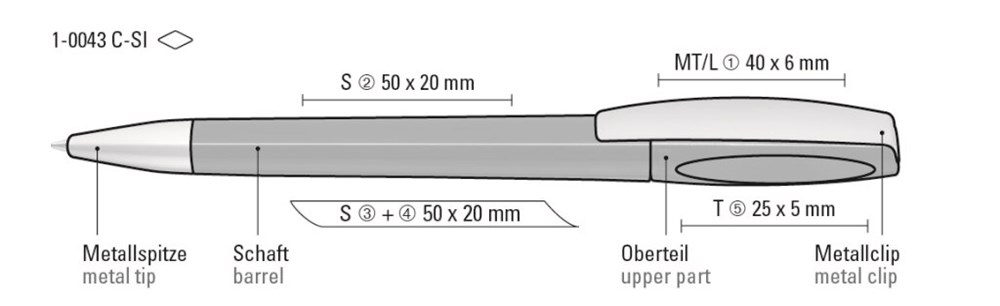 Drehkugelschreiber mit gedeckt glänzendem Gehäuse. Metallclip und schwere Metallspitze matt verchromt.