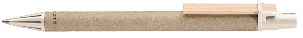 Druckkugelschreiber aus recycelter, naturfarbener Pappe. Spitze und Drücker unifarben aus recyceltem oder biologisch abbaubarem Kunststoff (*06-7527 Bio-Mix) sowie Holzclip.