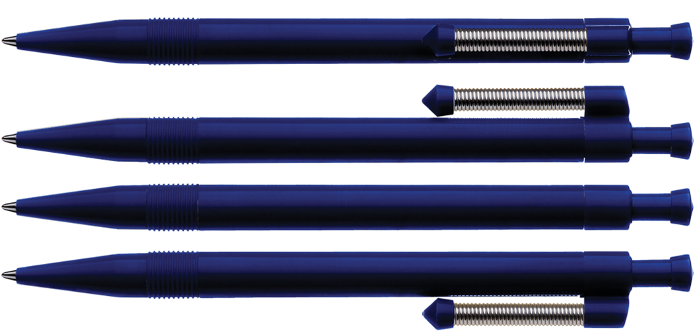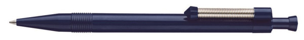 Druckkugelschreiber mit gedecktem Gehäuse und flexiblem und vernickeltem Metallfederclip.