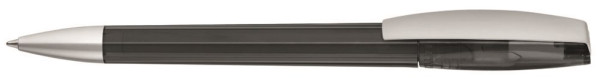 Drehkugelschreiber mit transparent glänzendem Gehäuse. Metallclip und schwere Metallspitze matt verchromt.