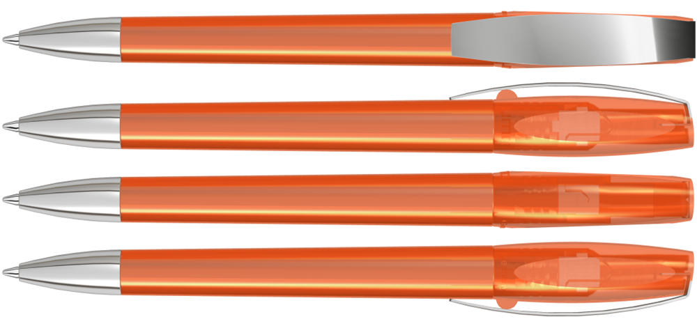 Drehkugelschreiber mit transparent glänzendem Gehäuse. Metallclip und schwere Metallspitze verchromt.