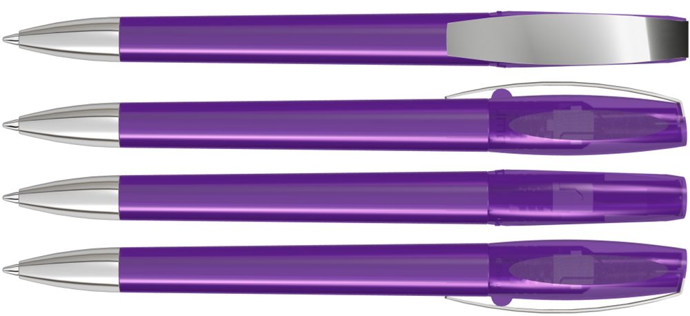 Drehkugelschreiber mit transparent glänzendem Gehäuse. Metallclip und schwere Metallspitze verchromt.