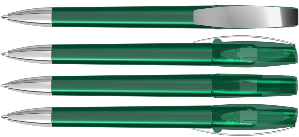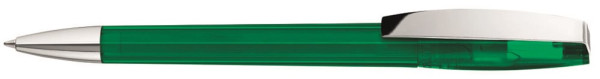Drehkugelschreiber mit transparent glänzendem Gehäuse. Metallclip und schwere Metallspitze verchromt.