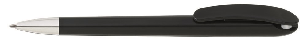 Drehkugelschreiber mit gedeckt glänzendem Gehäuse in schwarz oder weiß und farbigem Stopfen. Schwere Metallspitze glanzverchromt.