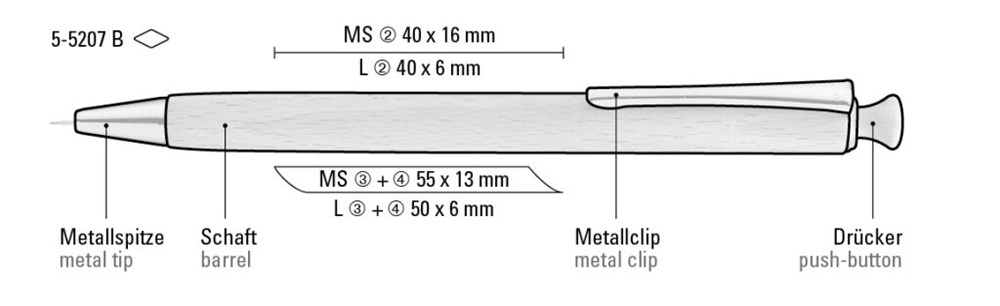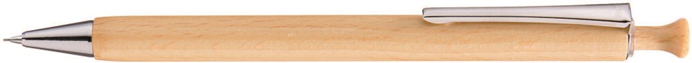 Holz-Druckbleistift (0,7mm) mit Holzdrücker, Metallclip und Metallspitze silber glänzend. Schaft und Drücker aus schutzlackiertem PEFC-zertifiziertem Buchenholz.
