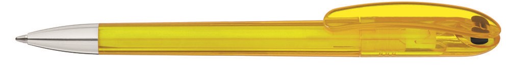 Drehkugelschreiber mit transparent glänzendem Gehäuse und farbigem Stopfen. Schwere Metallspitze glanzverchromt.