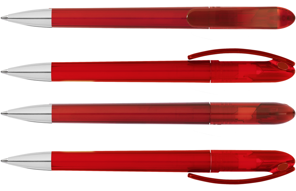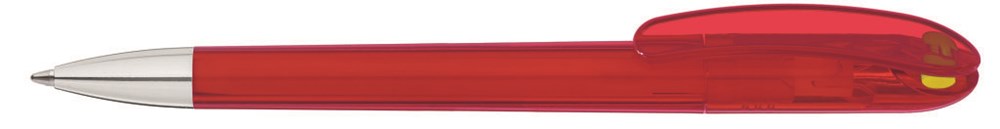 Drehkugelschreiber mit transparent glänzendem Gehäuse und farbigem Stopfen. Schwere Metallspitze glanzverchromt.