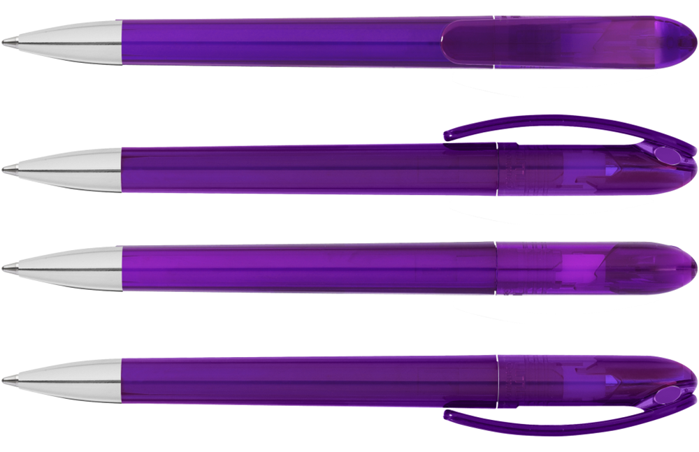 Drehkugelschreiber mit transparent glänzendem Gehäuse und farbigem Stopfen. Schwere Metallspitze glanzverchromt.