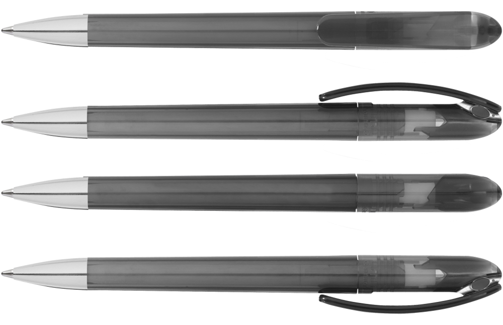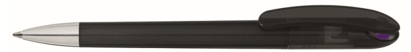 Drehkugelschreiber mit transparent glänzendem Gehäuse und farbigem Stopfen. Schwere Metallspitze glanzverchromt.