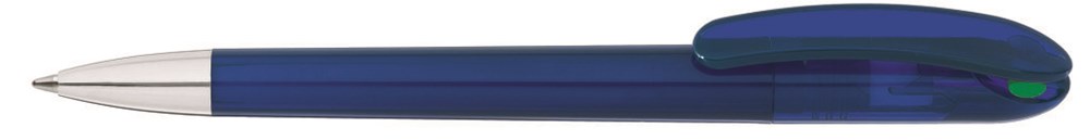 Drehkugelschreiber mit transparent glänzendem Gehäuse und farbigem Stopfen. Schwere Metallspitze glanzverchromt.