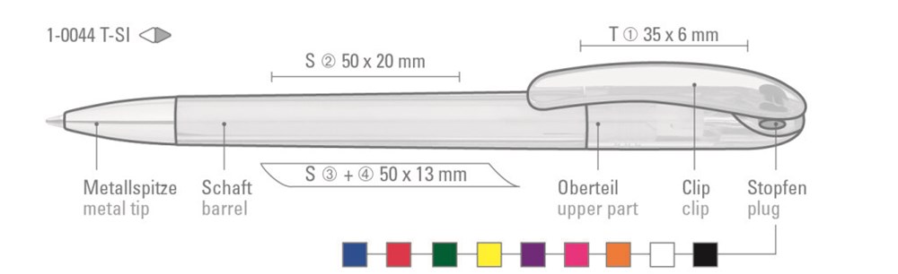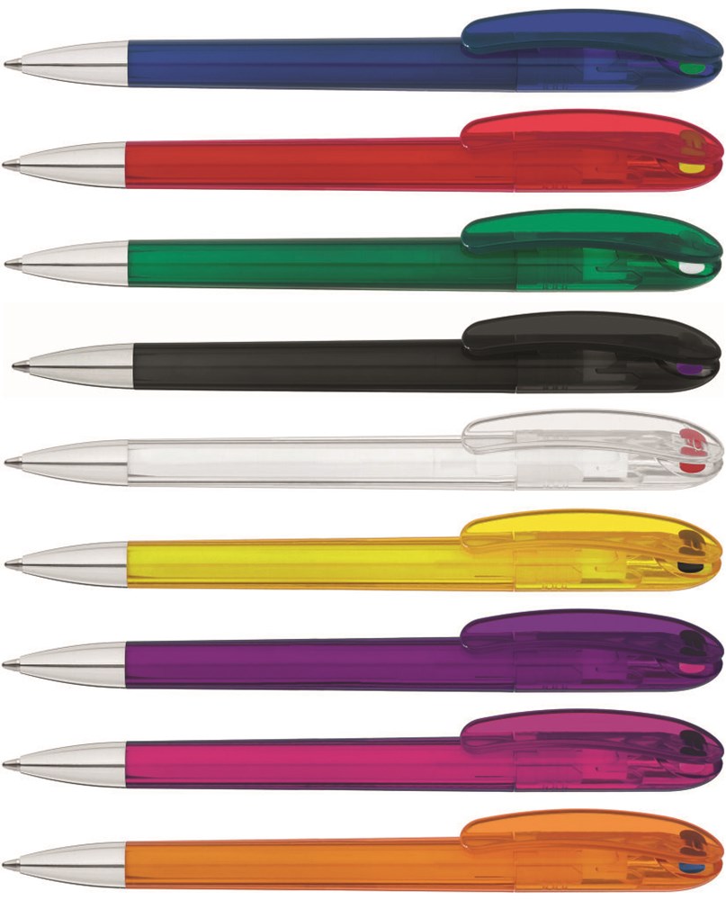 Drehkugelschreiber mit transparent glänzendem Gehäuse und farbigem Stopfen. Schwere Metallspitze glanzverchromt.